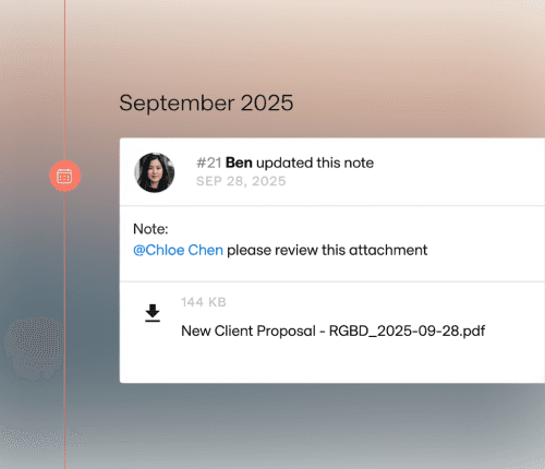 Log conversations, updates, and notes against every deal. Maintain full team context across the lifecycle of an opportunity — so if someone leaves, the relationship doesn't leave with them. A radical concept: your deals don't belong to one person.